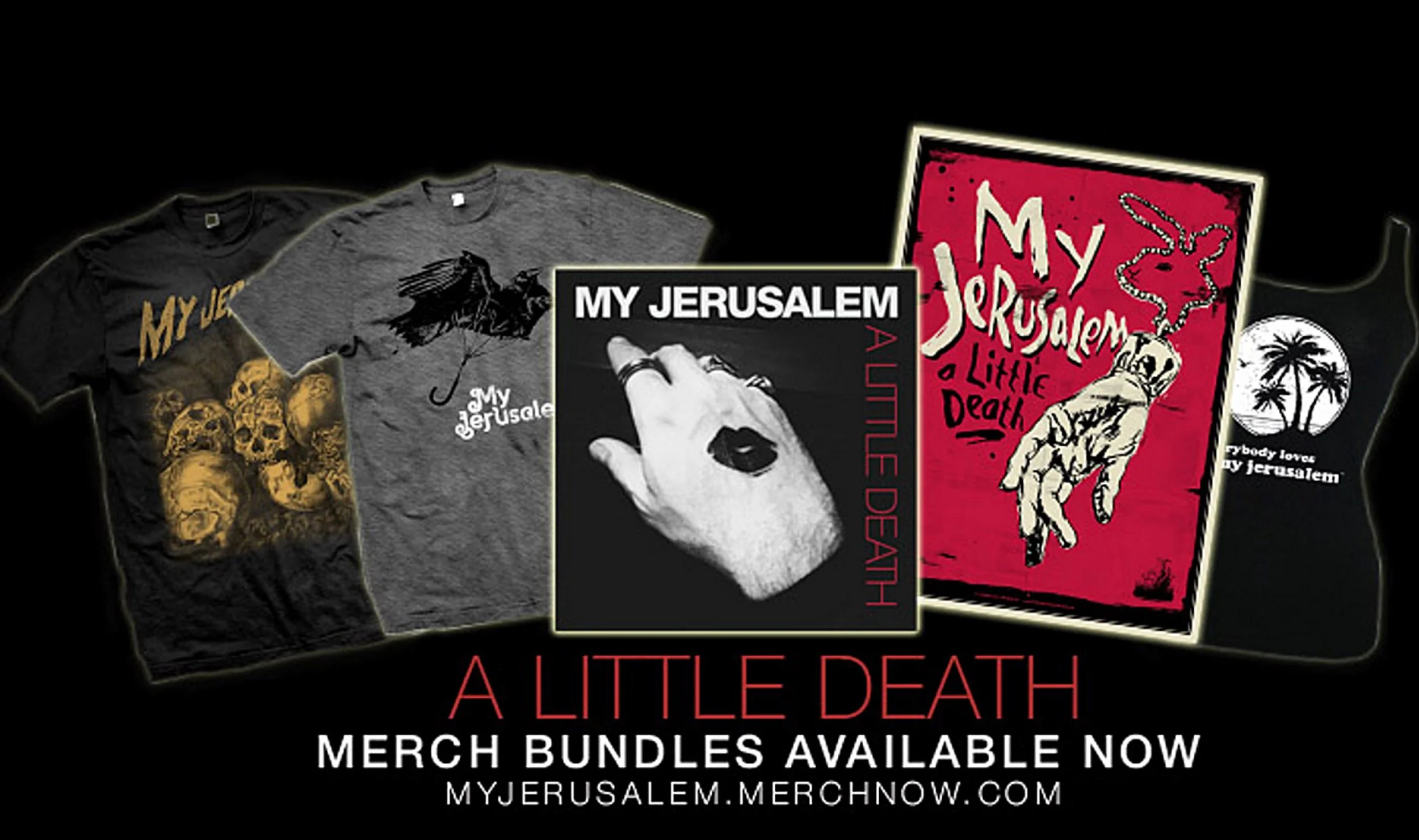 Selection of merchandise created for My Jerusalem's latest release "A Little Death"